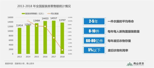 近5年,我国服装类零售额均值在1.3万亿左右,一件衣服的平均使用寿命一般在5年以内,年轻人的更换时间会更短,每年每人新购置的服装在8-10件,保守估计每年废旧衣物的存量在60亿以上,因此,可供旧衣物流通市场也在数千亿的规模。
