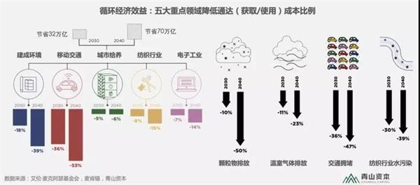 如上图所示,与中国现行发展路径相比,中国各大城市落实循环经济可大幅降低商品与服务的总体通达成本,2030年可节省32万亿人民币,到2040年可节省70万亿元人民币。同时,可吸入颗粒物PM2.5将明显减少,温室气体排放将显着降低,交通拥堵将得到明显缓解,同时,纺织行业造成的水污染也会得到改善。