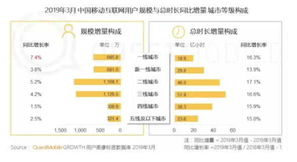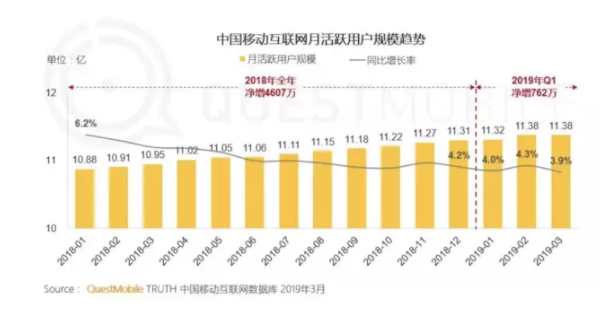 QuestMobile 发布了《 2019 年春季大报告》,2019 年 1-3 月,全国移动互联网新增每月活跃用户数量只有 762 万,不及 2018 年平均每季度超过 1000 万的用户增量。