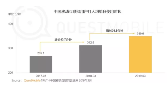 2019 年 3 月,每位移动互联网用户平均每天花在移动应用上的时间为 349.6 分钟(近 6 个小时) ,比去年同期增长了 36.8 分钟,但不及去年同期 16% 的增长速度,下滑至 12%。
