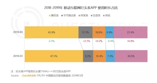 腾讯的产品依然占据着移动互联网用户最多的使用时间,但是已经出现下滑。据 Quest Mobile 统计,用户使用腾讯系应用的时长占使用所有移动应用的市场比例比去年同期下降了 3.7%,这一份额主要被抖音抢去:字节跳动系产品时长凭借着抖音的持续增长,增长了 3.1%。百度系产品也出现略微下降,阿里系产品和其它产品的增长都不到 1%。