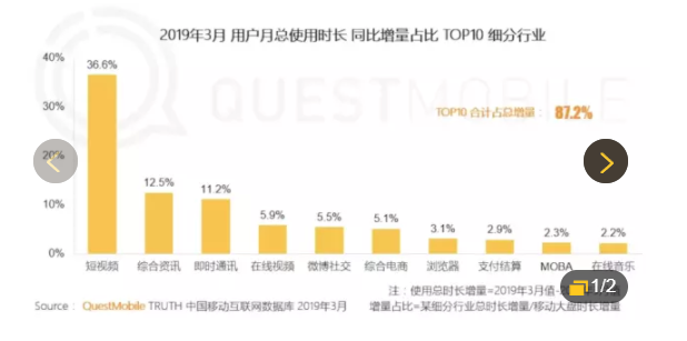 截至 2019 年 2 月,每月使用短视频类产品的用户已经达到 8.2 亿,但出现了增长放缓的趋势。3 月,每月使用短视频类产品的用户数量同比增速在过去 12 月中第一次跌破 50%,总用户数量较上个月也减少了 0.2 亿。