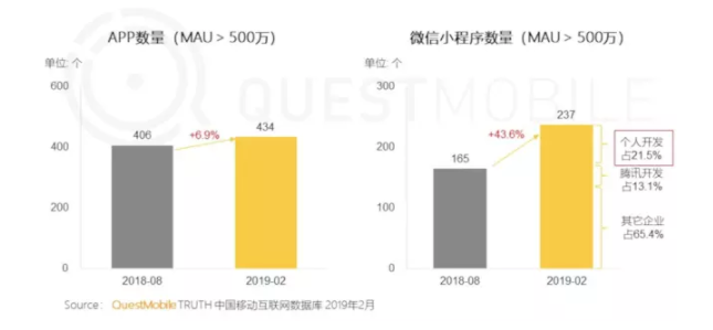 截至 2019 年 2 月,国内每日活跃使用人数超过 500 万的移动应用在过去半年内增长了 6.9%,而每日活跃使用人数超过 500 万的微信小程序数量则增长了 43.6%。