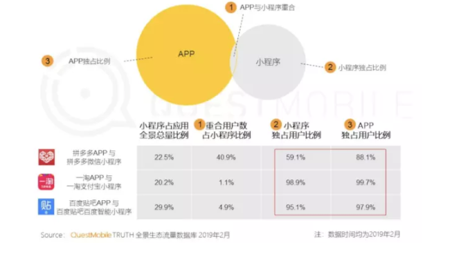 阿里的一淘应用与一淘支付宝小程序用户的重合比例只有 1.1%,百度贴吧与百度智能小程序的用户重合比例为 4.9%。拼多多应用和微信小程序用户重合比例较高,但也不超过 50%。