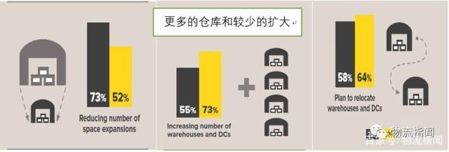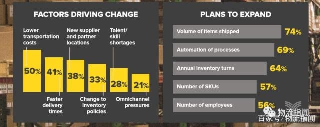 问及改变的驱动因素时, 50%回答是较低的运输成本, 41%答较快交货时间,38%答新供应商和合作伙伴地址,33%库存策略改变,22%答人才缺乏,21%答多渠道压力;问及扩张计划时,74%答会增加发货的项目,69%答会增加自动化过程,64%答加快库存周转,57%答会增加SKU数目,56%答会增加员工人数。