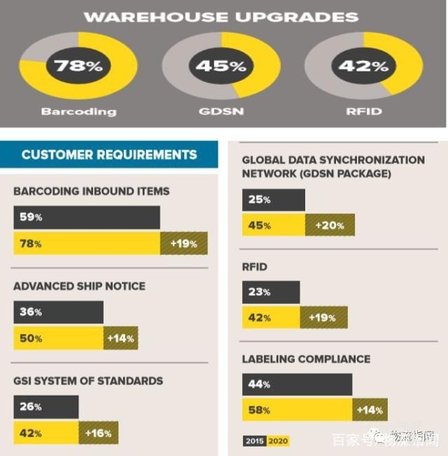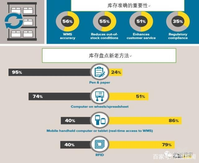 未来“盘点“--2015年95%的仓库使用纸笔,2020年只有24%;74%的人在2015年使用电脑软件EXCEL,只有51%在2020年还这样做;只有40%在2015年使用连接WMS的平板电脑,在2020年有86%的人使用;2015年只有40%的人使用RFID,在2020年有79%使用。
