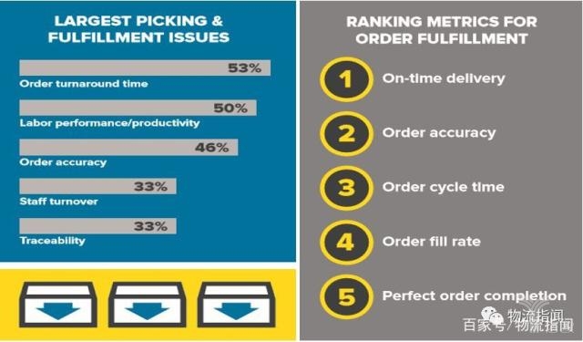 关于拣货和订单完成的问题,53%认为是订单周转时间或者员工表现(生产力),46%认为是订单准确性,33%认为员工流动性,33%认为是可追踪性