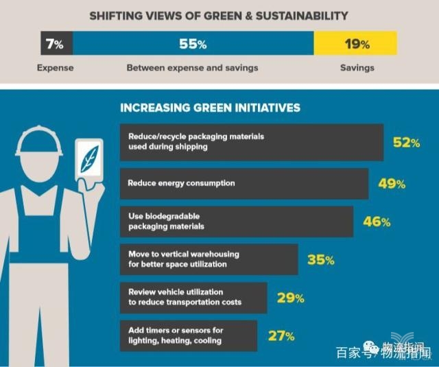 在环保方面,虽然大多数受访者表示他们认为绿色举措是一项费用,但他们也将此视为一种节省机会。例如,美容公司Kiehl's最近从包装盒转换为信封包装。此举反映了可持续发展的动力,但也最终降低了Kiehl的产品运输成本。在未来几年,整个供应链将变得越来越环保,仓储行业也不例外。