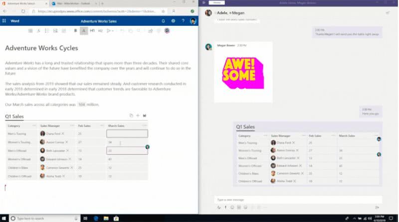 还有一个例子,当用户将自己Word中的表格在Microsoft Teams聊天界面中进行分享后,利用这一框架可以实现表格实时共享。也就是说,当用户在Word中进行信息修改时,聊天界面的表格信息会随之同步。