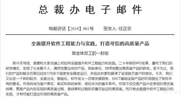但实际上华为对网络安全十分重视,今年年初,华为总裁办发出2019年的一号文件,即华为创始人任正非致全体员工的一封信,题目为“全面提升软件工程能力与实践,打造可信的高质量产品”。任正非在文件中称:公司已经明确,把网络安全和隐私保护作为公司的最高纲领。