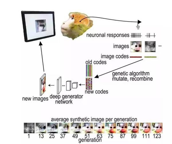 研究团队将微电极阵列植入六只猴子的下颞叶皮质 (耳朵上方稍微靠后的区域),向它展示图像,并测量猴子在观看图像时单个视觉神经元的放电率。GAN每次随机生成40个图像,其中有10张是令给定神经元或神经元群中最活跃的图像,另外30张是由遗传算法根据神经元的不同反应,对这10张图片中的元素进行重新排列组合生成的类似图像。