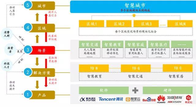 智慧城市的实现架构,就是在不同的区域城市中,实现各个应用场景的模块化组合,以此来提升城市引力,获取的数据进一步反哺技术升级。除了新的人工智能网络的搭建、智能产品的生产和不同行业的应用,包括现下常见的生活服务场景(如滴滴打车、饿了么等)在内,共同构成了智慧城市场景体系。场景平台获取大量可分析的市场需求数据,这些数据磨练和提高计算的能力,还会倒逼软件硬件设施及技术的更快发展。