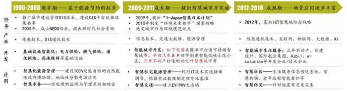 ①企业主导,以开发商与技术商联合,政府引导的模式推进:政府设立试点城市,调动三井不动产、松下、日立等开发商与技术商联合共同实施,以能源、基建、城市安全为核心关注点。
