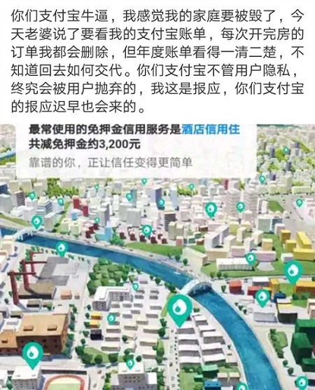 去年年初,网上流传这样一个段子,一位已婚男性用户向支付宝发出“抱怨”,称后者发布的2017账单暴露了他过去一年的开房记录,以致于家庭被迫走在毁灭的边缘(图片如下):