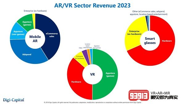 Digi-Capital预测苹果公司将在2020年底推出基于智能手机的AR眼镜,但是否上市还真的是个未知数。因此,AR智能眼镜的主要收入来源可能仍将是硬件销售和企业软件/服务。