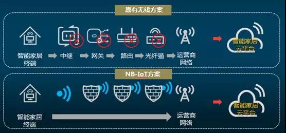 中国电信物联网公司相关负责人在一次演讲中以智能家居终端为例,若采用以往WiFi、Zigbee等短距离连接的无线方案,则终端数据要达到智能家居平台过程中需要经过中继、网关、路由、光纤猫等各类中间设备,多跳至运营商网络中,最后再传输至智能家居平台中进行数据处理;而采用蜂窝网络的方案,则智能家居终端仅需一跳通过运营商网络即可直达智能家居平台。