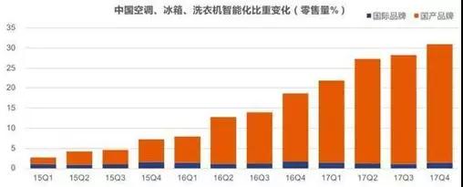 市场调研公司GfK去年发布报告显示,国内空调、冰箱、洗衣机等大家电智能化比重从2015年不足5%快速上升至2017年底的30%,也就是说30%新出售的大家电已配置通信模块、APP等智能化装置。各家电厂商已将很多产品的智能化作为标配,这一比例预计还会继续快速上升。