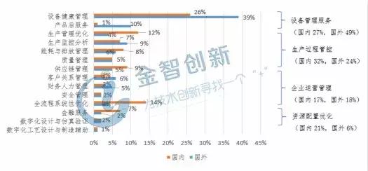 对比国外,国外纳入统计的平台应用案例共186个,平台应用侧重于设备管理服务,占比将近50%。我国平台相较于国外平台在制造业企业数字化水平上还有较大的差距。