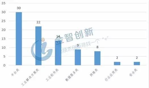 在榜单中,涉及平台类领域的企业数量最多达到30家,50佳榜单企业有六成企业涉及平台类业务,工业解决方案类和工业软件类分别有22家和14家企业涉及,此外,安全类企业仅有两家,数量最少(部分企业主营业务涉及多个领域)。