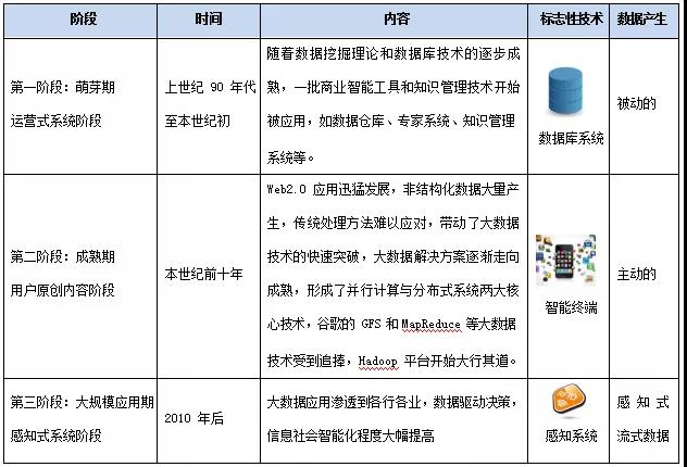 信息化科技的发展为大数据时代的到来提供了相应的技术支撑:存储设备的容量不断增加、CPU 处理能力大幅提升以及网络带宽的不断增加促成了大数据时代的来临。如表 1表示大数据发展的三阶段①中所述,大数据经历了运营式系统阶段、用户原创内容阶段和感知式系统阶段。