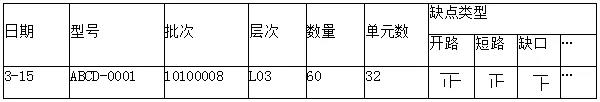 手工记录表:无论是早期的人工目检还是现在自动光学检测,操作人员均使用记号笔在 PCB 板上标识缺点位置,并用表格的方式进行检测结查的记录,相信大家对下面表格(表 2 :xxx 检测结果记录表)并不陌生。各检测工序除了缺点类型不同之外,记录的内容大同小异,并通过画“正”字的方式来记录问题点的种类和数量。