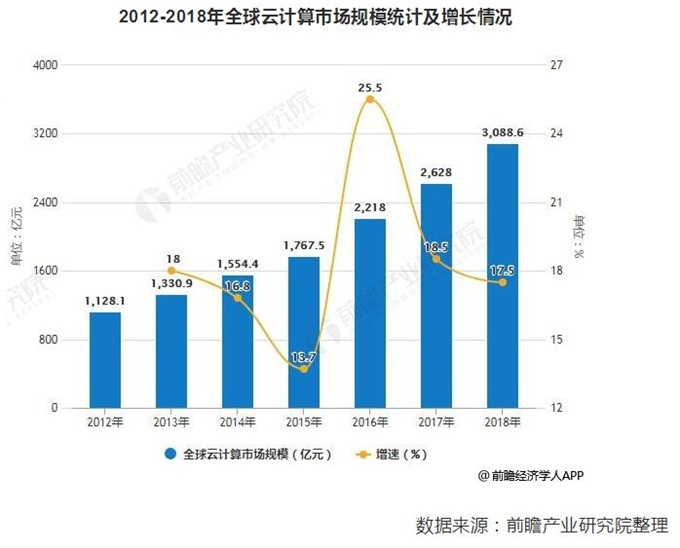 目前,全球云服务正处于高速发展期,据前瞻产业研究院发布的《中国云计算产业发展前景与投资战略规划分析报告》统计数据显示,2012年全球云计算市场规模已达1128.1亿元。并呈现逐年快速增长态势,进入2016年全球云计算市场规模突破了2000亿元。截止至2017年全球云计算市场规模增长至2628亿元,同比增长18.5%。初步测算2018年全球云计算市场规模将突破3000亿元,达到3088.6亿元左右。