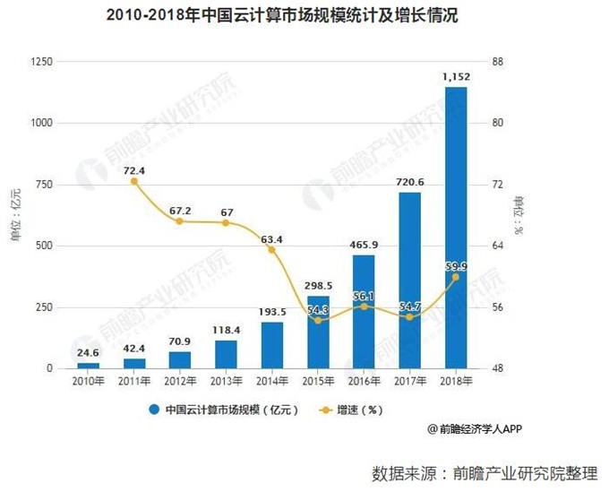 近年来,国内云计算行业发展火热,2010年中国云计算市场规模仅达24.6亿元。2013年后进入高速增长期。2013年中国云计算市场规模突破了百亿元。截止至2017年中国云计算市场规模增长至720.6亿元,同比增长54.7%。初步测算2018年中国云计算市场规模将突破千亿元,达到1152亿元左右。