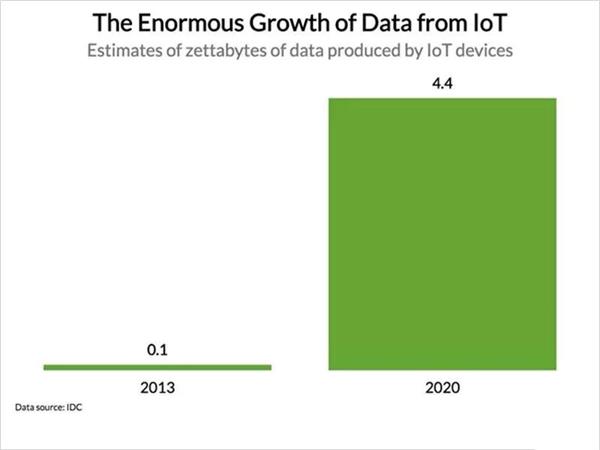 正如前文所讲的那样,数据规模正变得越来越“庞大”。 据IDC预测,物联网设备产生的数据从将2013年的0.1ZB增长到2020年的4.4ZB。