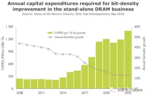 然而,随着每一代技术的发展,存储密度增长也变得越来越昂贵。例如,随着工艺节点迁移,多图案化要求增加,导致额外的工艺步骤,因此每片晶圆的生产需要更大的洁净室空间。现有的DARM和NAND技术仍在进行大规模的年度资本支出(CAPEX)和研发投入,达到数十亿美元。不过由于2018年末的产品价格下跌,CAPEX投资正在减少,以便快速实现均衡的市场状态。长期来看,预计每1%的比特增长所需的CAPEX将持续上升,如下图所示的DRAM情况。