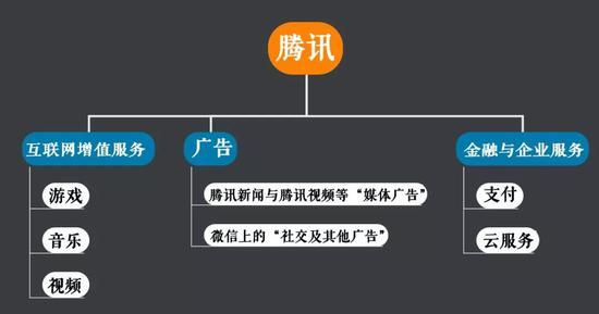 在2018年下半年进行组织架构调整后,腾讯重新梳理了旗下不同的业务模块,将其分为三类:游戏、视频、音乐等互联网增值服务;广告(分为腾讯新闻与腾讯视频等“媒体广告”和微信上的“社交及其他广告”);金融与企业服务等。