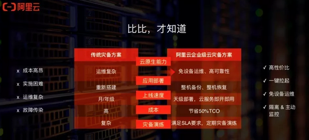 阿里云在近日发布了旗下的企业级云灾备解决方案,依靠阿里云强大的IT基础设施云化的灾备能力,阿里云帮助用户完全省去了灾备机房的建设规划过程,大幅度削减了建设成本和硬件运维的成本。正如前文笔者提到的那样,在成本高昂、实施困难、运维复杂、故障传染等一系列传统灾备面临的问题之下,阿里云通过采用国内首个磁盘级的数据持续复制技术,同时支持混合云和跨云的多平台融合架构为来自各行各业的企业用户输出五大能力:用户数据中心和公共云的相互容灾;业务不停机,完成容灾演练;首个云原生支持弹性容灾,只需部署最低负载;一键容灾快速恢复,RTO、RPO可达秒级;完善的数据加密体系,保证数据的极致安全。