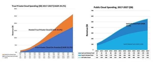 如果对比同期2018年9月Gartner公有云预测报告,数字则更为激进:2019年真正私有云市场就以510亿美元逼近公有云IaaS&PaaS的583亿美元,2020年就会首次达到729亿美元的相同规模,并实现持续超越。