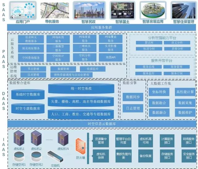 智慧城市时空大数据平台的核心是为智慧城市建设提供时空基础设施的云管理平台,满足各行业或公众对于智慧城市时空大数据平台的直接或间接应用需求,实现对时空大数据的管理、挖掘、服务、展示、应用等。根据时空大数据平台建设需求,将平台按照IAAS层、DAAS层、PAAS层、SAAS层进行软件架构分析和设计。