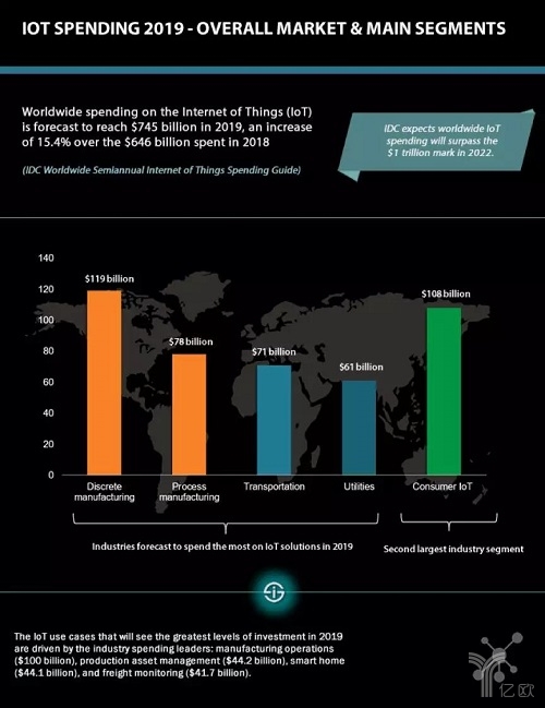 在制造业务方面,2019年的最高投资额将为1000亿美元,而生产资产管理在物联网用例中排名第二,预计2019年为442亿美元。