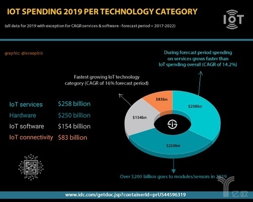 物联网硬件,包括物联网模块、传感器以及物联网解决方案所需的所有设备,如物联网网关,以2500亿美元的预期支出排名第二,其中超过2000亿美元将用于模组及传感器。
