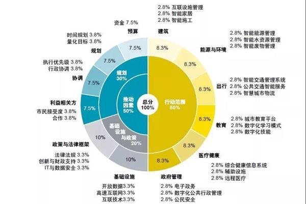 总体而言,各个城市有倾向性地重视部分战略方针,例如关注管理与出行,而忽视教育与健康等。但仅有少数智慧城市战略的行动领域综合方案拥有必要的战略“推动因素”。