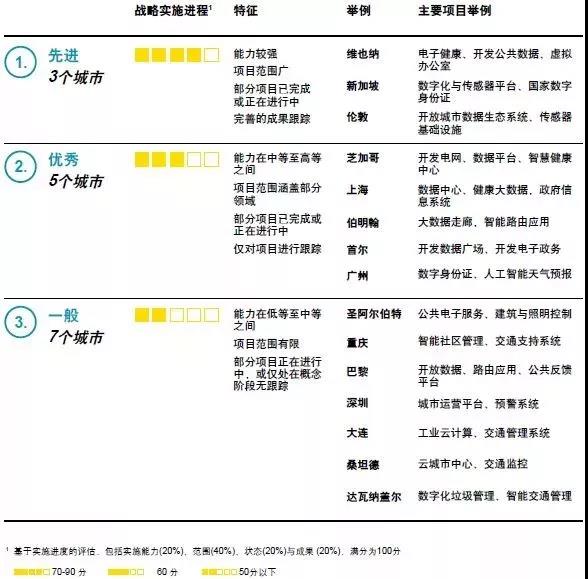总体而言,尽管欧洲和北美的智慧城市数量更多、部分战略的水平更高,但亚洲城市的总体表现更好。中国城市的排名最靠前,排名第六的上海与排名第14的广州都拥有智慧城市五年计划,这些计划也是中国国家智慧城市规划的组成部分。