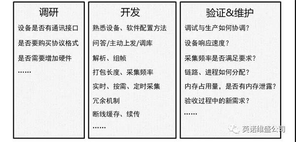 痛点1:数据采集问题——因为不能影响工业现场的生产进度,通常现场经常遇到调研进展慢、开发难度大,验证维护周期长,严重影响了数据采集项目的开发与实施进度,特别是在验证与维护方面还存在很多的隐性成本,在意想不到的地方还会冒出问题。工业现场设备联网需涉及的问题如图2所示。