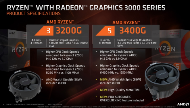 AMD还公开了Ryzen 3 3200G和Ryzen 5 3400G,前者4核4线程最高频率可达4.0Ghz,集显为Vega 8;后者4核8线程最高频率为4.2GHz,集显升级至Vega 11。得益于Vega 11集显的性能大幅提升,Ryzen 5 3400G在AMD演示的3A游戏中,帧数均达到了i5-9400的两倍以上。