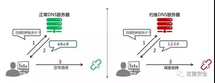 图中详细解释了域名劫持的整个过程,通过域名劫持黑客可让你访问他事先伪造好的钓鱼网站,来使你进行支付、输入信息等操作。
