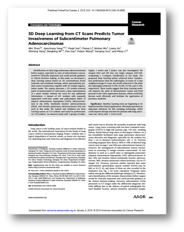 “在治疗方面,我们在去年首发了用影像分析去针对肺癌的腺癌做病理分类。今年,我们还会用影像去做人类表皮生长因子过度表达的病人预测,目前这两块的研究成果分别被Cancer Research和CancerMedicine收录,这个其实是跨组学的,即从影像组学去预测基因组学,这是靠肉眼完全达不到的。此外,我们的AI工具还有一个功能就是用影像分析去对肿瘤药的治疗疗效进行评估,据我所知这件事还没有团队做成。”葛亮解释说。