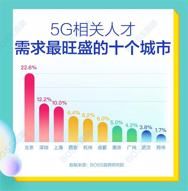 一方面是薪资的水涨船高,另一方面5G人才的需求量也在快速增长。2019年1月到5月,5G人才需求总量已接近2018年的60%,较2018年同比增长38.9%。在具体的城市分布上,5G人才需求最为旺盛的城市是北京、深圳、上海,这也和当前通信产业的集中度相关。以深圳为例,华为、中兴等通信巨头的总部都在此地。另外,这三个城市最近也相继宣布将在今年年底前建成超过一万座5G基站。