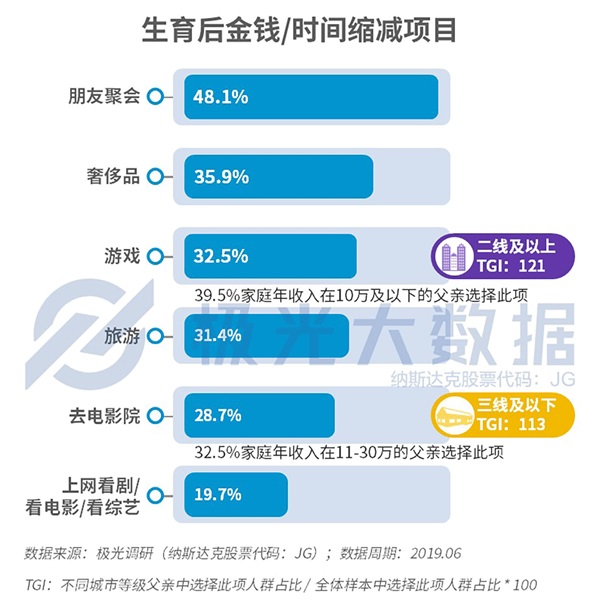 ●为育儿愿做适当牺牲:父亲们为育儿减少了在朋友聚会方面的时间和金钱花费,更多三线及以下城市的父亲减少了去电影院的花费