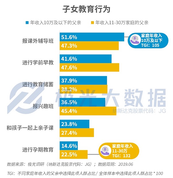 ●教育从孕期抓起:年入10万及以下的家庭更热衷报课外辅导班,年入11-30万的家庭更重视孕期教育