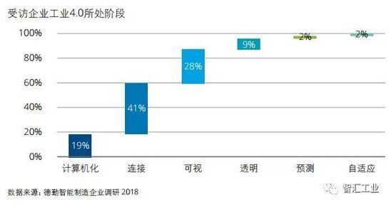 随着中国两化融合和工业物联网建设等多项举措推进,制造型企业数字化能力素质显着提升,大部分企业正致力于数据纵向集成。德勤调研结果显示,81%的受访企业已完成计算机化阶段,其中41% 处于连接阶段,28%处于可视阶段,9%处于透明阶段,而预测和自适应阶段的企业各自占2%。