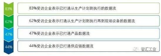 结果显示,83%的受访企业表示已打通ERP和MES的数据流打通。62%的企业继续向 下打通MES到现场设备的数据流。但仅有47%的企业打通了产品数据流,44%的企业打通供应链数据流。而且考虑到我们调查的企业均为资质较好且为中等以上规模,这一系列比率显然高于中国整体平均水平。