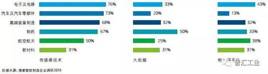 从行业应用来看,电子及电器行业传感 器和平台应用最为普及,76%的受访企业利用传感器采集数据,43%的企业利用物联网平台,但仅有33%的企业采用大数据技术分析所采集的数据。汽车及零部件制造行业传感器技术应用也有较高普及率达73%,但大数据和平台应用低于其他受访行业。制药行业大数据技术利用最为积极,因为医药行业早已面临海量数据和非结构化数据挑战(见下图)。