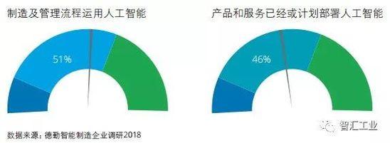 德勤智能制造调研发现,51%的受访企业在制造和管理流程中运用人工智能,46% 的受访企业在产品和服务领域已经或计划部署人工智能(见下图)。制造和管理流程中人工智能的运用更偏向系统自动化和制造精益化,目的是提高生产效率和产品质量,同时人也被解放出来,可以去思考更复杂的问题。主要应用场景包括使用机器人实现流程自动化、柔性制造、定制化生产、质量检测等。在产品和服务领域人工智能的运用更侧重产品和服务与使用者的互动,典型应用包括研发和新品测试、用户行为分析、自动驾驶等。
