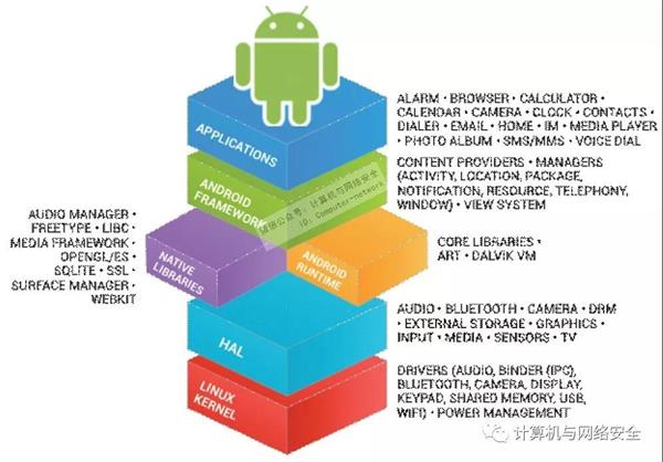安卓应用:通常使用Java开发,运行在Dalvik/ART虚拟机中,除此之外还包括一些二进制的组件。应用中不论是虚拟机还是二进制的部分都在相同的安全域,也就是该应用的沙盒中。