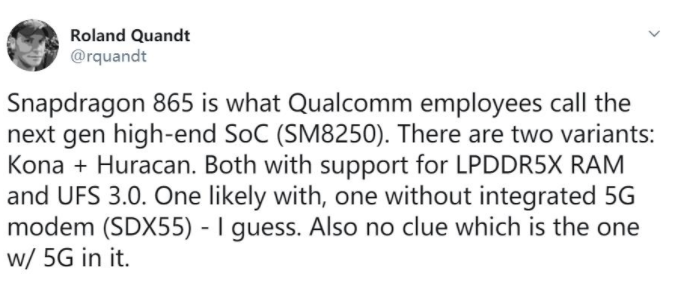 根据爆料人Roland Quandt的说法,骁龙865将支持最新的存储规格并且会推出两个版本,分为搭载和不搭载5G基带的两个型号。他还透露,2020年会随手机产品上市的旗舰处理器高通骁龙865内部代号为SM8250,继承了骁龙855代号为SM8150的命名规则。